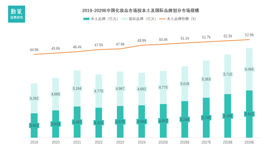 以零售额核算,本土化妆品行业市场规模从2019年的3▼,502亿元增长至2024年的4,664亿元,复合年增长率达5•▲.9%;预计2024-2029 年将以7.9%的复合年增长率持续攀升▼,2029年有望突破6,813亿元,增长表现显著优于在际品牌。