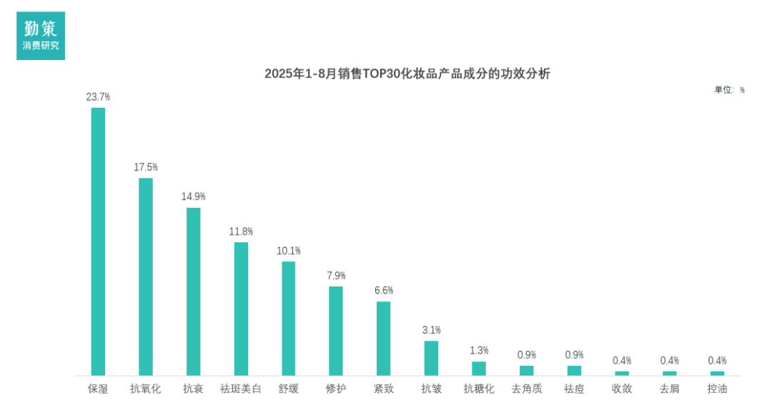 其中,保湿以23.7%的占比位居榜首,构成了最基础且广泛的需求。与此同时,抗氧化与抗衰(14.9%)两大功效紧随其后…-,合计占比超过30%,表明“抗初老”与-◆“抗光老化▲”已从进阶概念转变为大众核心诉求。