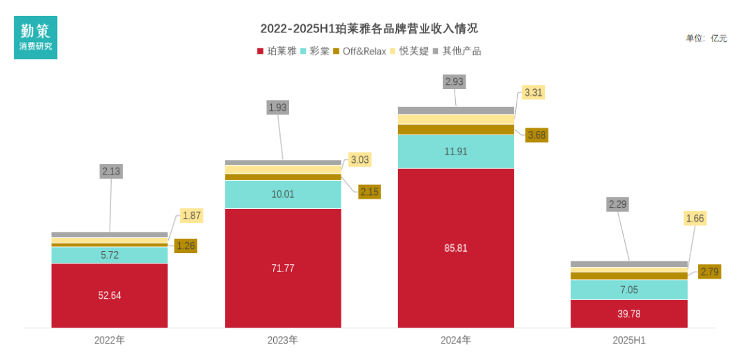 ★,但其他品牌尚在培育期■◁▲。专业彩妆品牌“彩棠”表现最为突出,营收从2022年的5.72亿元快速攀升至2024年的11.91亿元,实现了规模翻番=,成功跻身10亿级品牌-,成为集团内最具增长潜力的新引擎■…◁。相比之下,洗发品牌◇▲▼“Off&Relax”和大众护肤品牌…•■“悦芙媞▷”规模虽小但保持增长•…,显示其细分市场定位得到初步验证。“其他产品”线规模稳定,或代表新品牌孵化和探索★◇。
