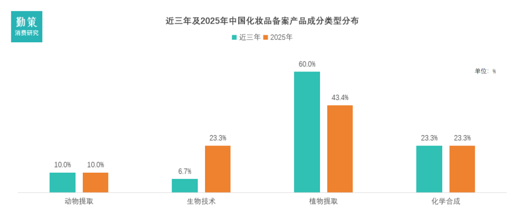 与此同时△•=,长期占据主导地位的植物提取成分占比则从60▽…•.0%显著下降至43◇▲▪.4%,显示出市场热点正在发生结构性转移。而化学合成与动物提取成分的份额保持稳定,分别为23.3%和10.0%=。