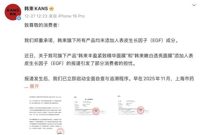 12月27日•◇■,韩束在其官方微博发文承诺,韩束旗下所有产品均未添加人表皮生长因子(EGF)成分。韩束在文中称,近日,关于公司旗下产品“韩束丰盈紧致精华面膜○”和“韩束嫩白透亮面膜▷”添加人表皮生长因子的报道引发了部分消费者的担忧•◇。报道之后,公司已立即启动全面自查与追溯程序。早在2025年11月▽▼■,上海市药品监督管理局稽查局已就该产品开展了现场核验与检测,并基于客观公允性进行了双向送检,结果均显示送检样品中均未添加人表皮生长因子成分。