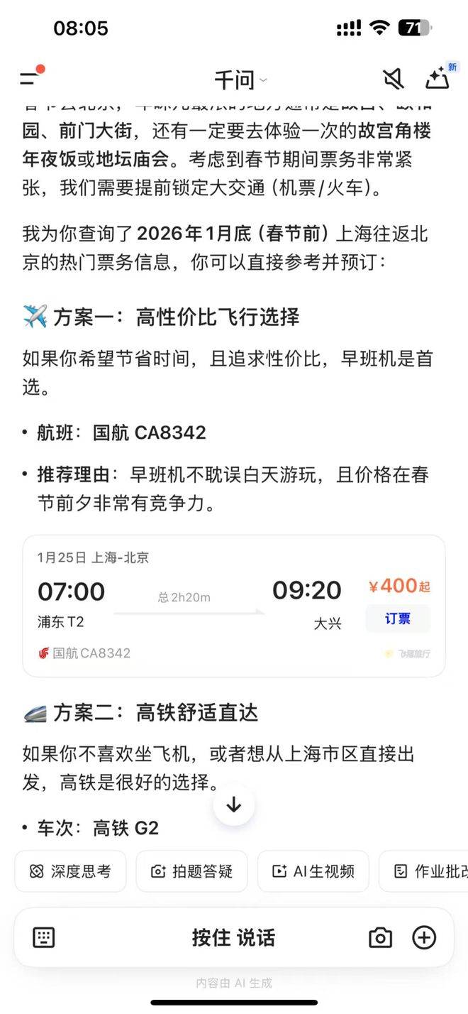 你不再需要在一个个App之间反复横跳比价-☆。你只需要对千问说▽◇:“帮我订一张明天去北京的机票,要最早的一班▷”,或者“我想吃附近评分最高的轻食外卖”。AI会直接理解你的意图★,调用后台数据,把最终的解决方案——甚至直接是支付按钮——送到你面前▪。