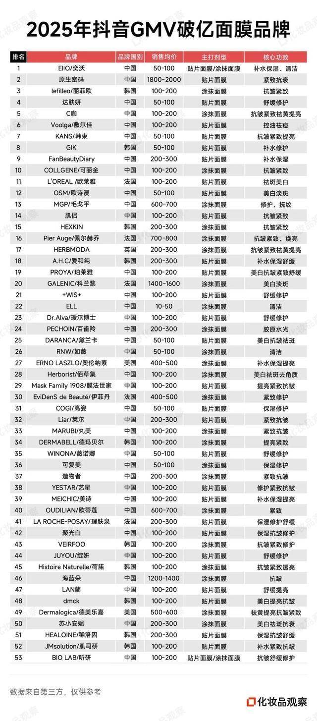 作者:emc易倍下载 日期:2026-01-17 浏览: 来源:易倍emc穆里尼奥官方面膜GMV破亿品牌数量高达53个,多于面护套装、乳液面霜,与面部精华持平。就主流整体来看,2025年面膜销售破亿品牌的数量约70个,与面护套装■…●、面部精华品类的亿级品牌数量,也不相上下-。