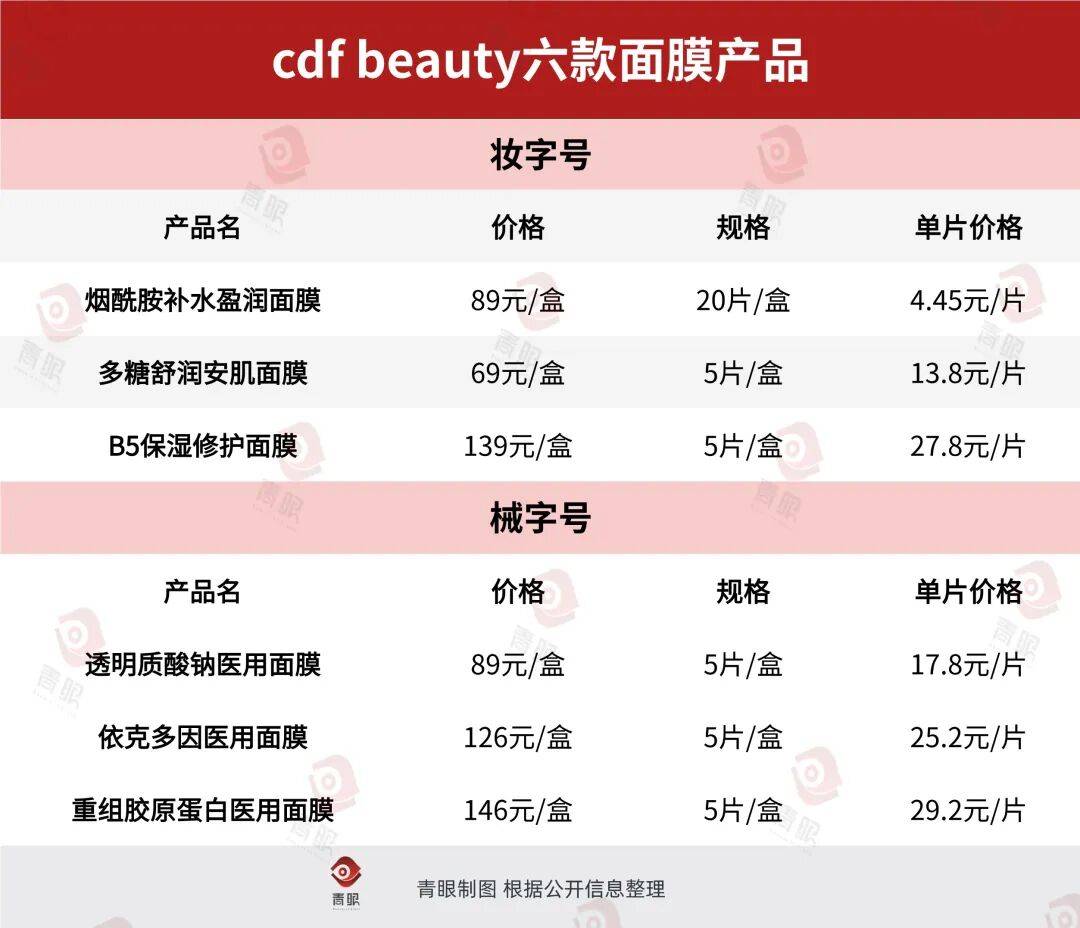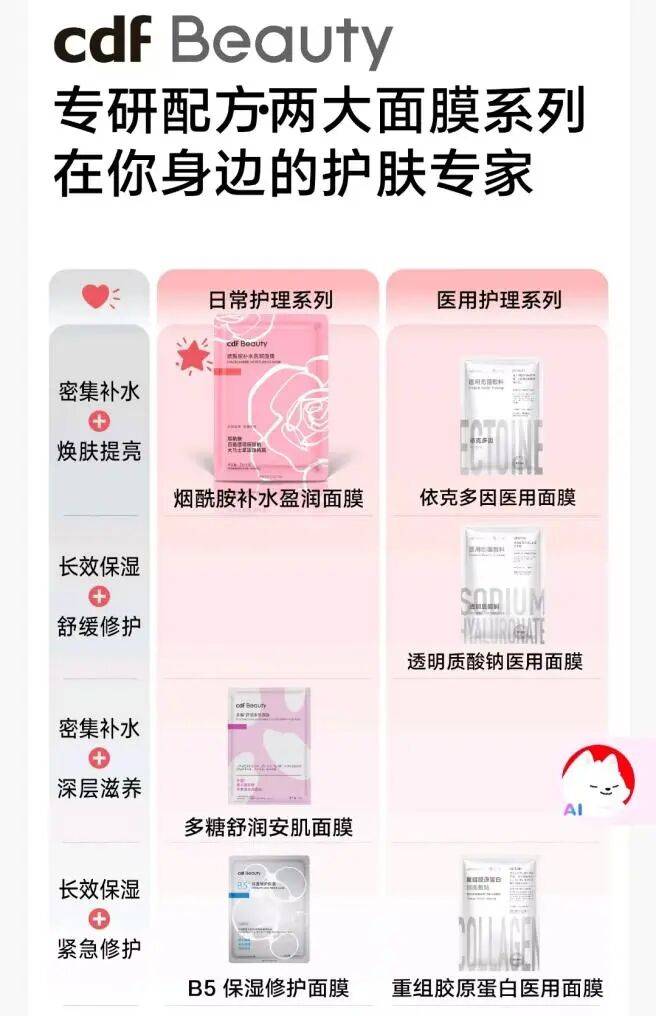 据了解,cdf Beauty推出的六款面膜,涵盖3款妆字号(烟酰胺补水盈润面膜、多糖舒润安肌面膜、B5保湿修护面膜)与3款械字号(透明质酸钠医用面膜、依克多因医用面膜、重组胶原蛋白医用面膜)产品。