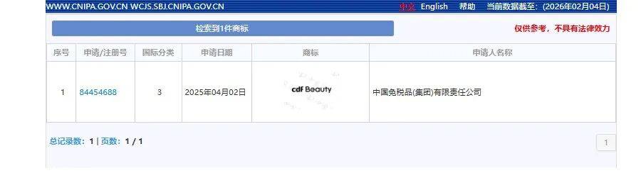 不过,青眼通过国家知识产权局官网查询发现,化妆品类的“cdf Beauty”商标归属于中国中免旗下子公司——中国免税品(集团)有限责任公司所有,公示的申请日期为2025年4月2日。