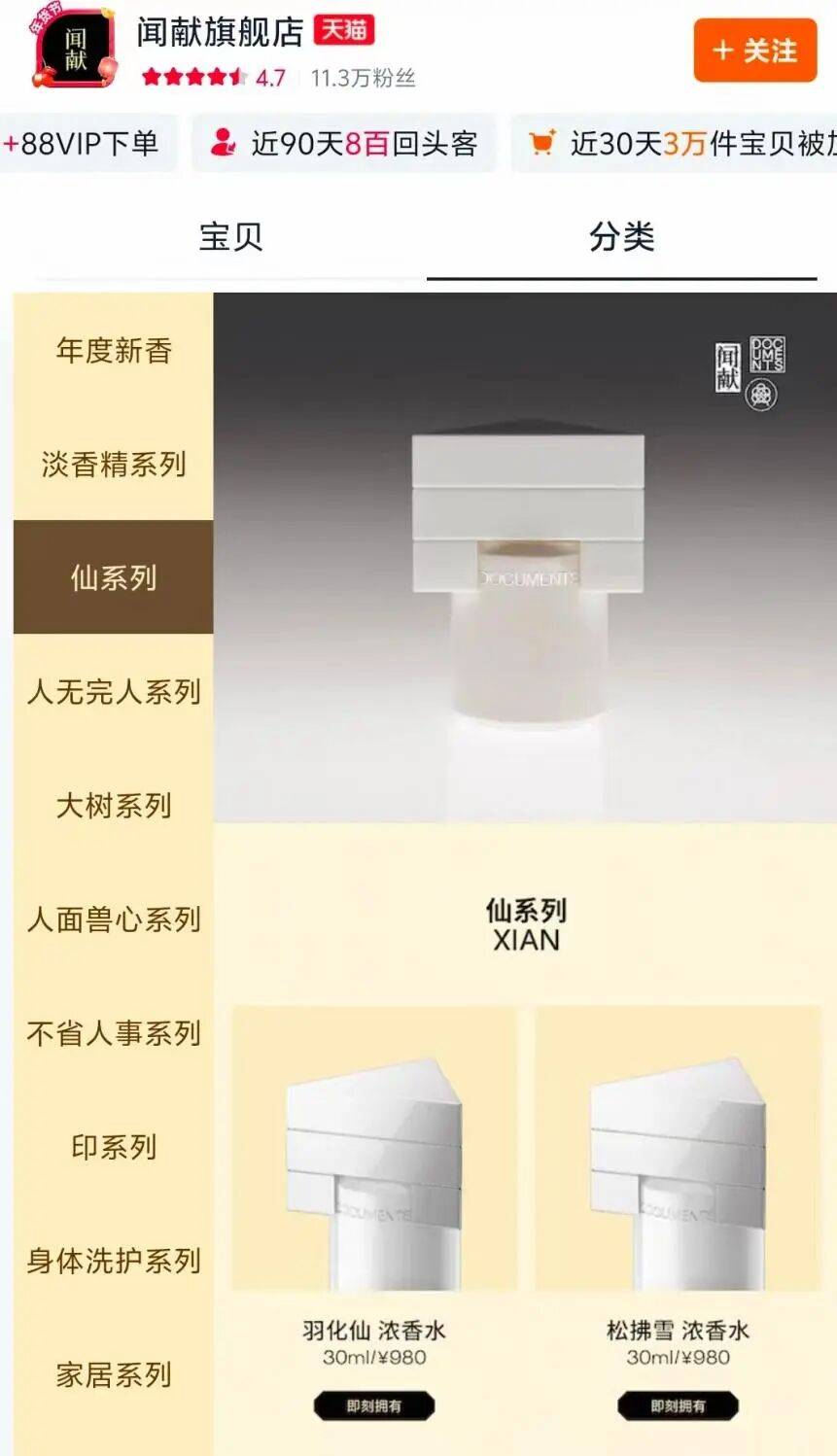 值得关注的是,此次联名系列在定价上明显低于闻献常规产品线。例如,cdf Beauty 50ml旅行香水售价319元,而闻献在天猫旗舰店销售的淡香精系列30ml价格为620元,浓香水系列30ml更高达980元。按容量折算,该联名款香水价格约为闻献同类产品的一半。