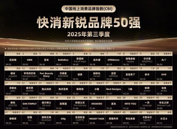 作者:易倍emc穆里尼奥官方 日期:2026-02-14 浏览: 来源:emc易倍下载2026年2月9日,北大国发院依托淘宝天猫平台2025年第三季度的真实消费行为,发布了“快消行业新锐品牌榜”,聚焦日用个护、日用清洁、日用美妆与母婴亲子四个快消子行业的新兴品牌。花知晓、HBN、至本跻身榜单前三,BeBeBus成为母婴行业第一,希望树成为家清行业第一,Off&Relax成为个护行业第一。